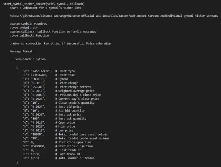 websocket 연결을 프로그래밍하려고 하는데 변수가 무엇을 의미하는지 잘 모르겠다면 Binance API 설명서를 확인해야 한다.